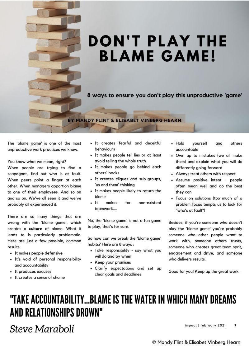 Posted | 0 comments An article from our IMPACT Magazine With Elisabet Vinberg Hearn #leadershipimpact #superchargedleader #blamegame